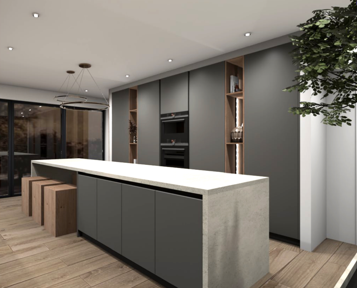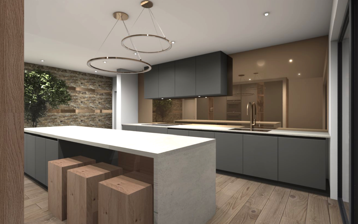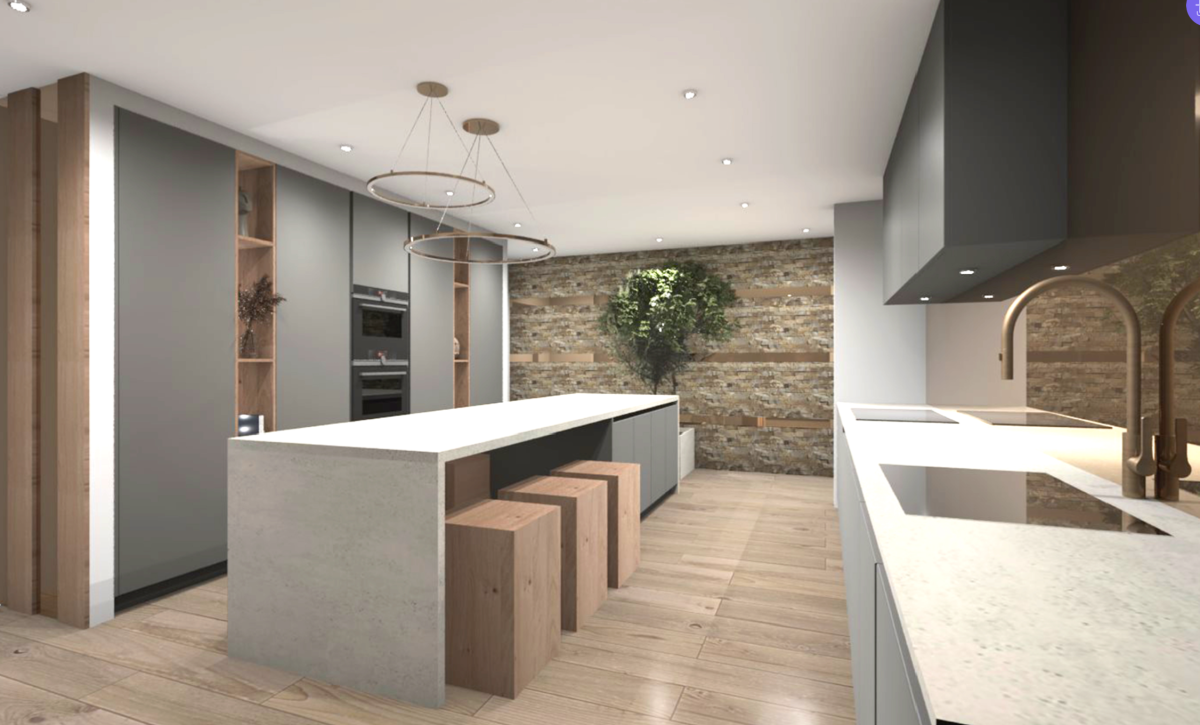 À votre gauche, vous aurez une cuisine de 28m2 toute équipée avec un accès direct sur l'une des terrasses extérieures.